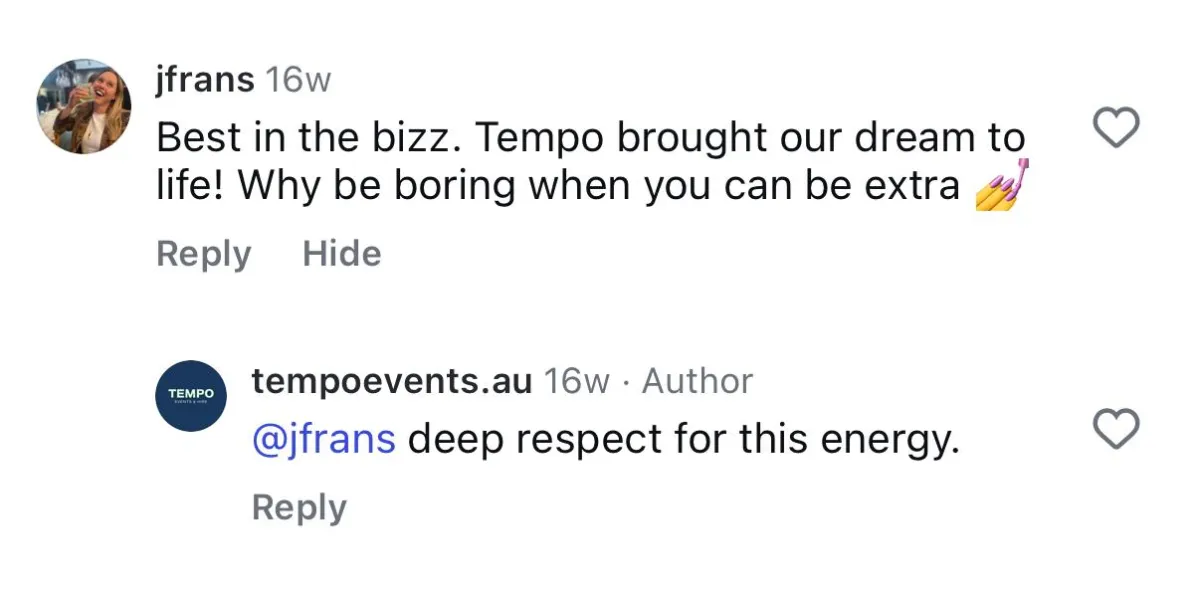 We started Tempo after the marquee hire company we used left us stranded two days before our own wedding. From that experience, we knew couples deserved a vendor who understood their vision and worked with them to bring it to life. With over a decade in the event management industry, it was a no brainer to build something better. Now we’re all in on your wedding, making sure the planning is exciting, the day looks incredible, and everything flows the way it should.